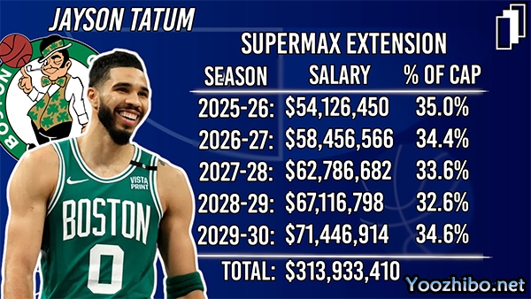 塔图姆早已具备提前续约超级顶薪的资格,自由球员市场开启后,塔图姆在合同还剩下2年的情况下,与绿军提前续签5年3.14亿美元的历史最大合同。
