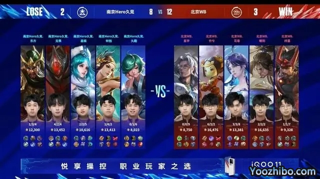 决胜局,南京Hero久竞蓝色方,拿到了白起+王昭君。北京WB红色方,拿到了宫本武藏+鲁班七号。开局北京WB击杀王昭君,拿下一血。9分钟,南京Hero久竞一波团灭北京WB,直推中路一塔。19分钟,北京WB直推下路高地。决胜团,北京WB花卷海月单切虞姬,一波团灭南京Hero久竞,直推水晶,拿下最终胜利!