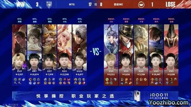 第一局,MTG蓝色方,拿到了露娜+马可波罗。西安WE红色方,拿到了宫本武藏+戈娅。开局MTG击杀牛魔,拿下一血。7分钟,西安WE上路击杀对面上野,直推中路一塔。17分钟,西安WE击杀露娜,直推下路高地,经济差拉开8千。决胜团,西安WE拿下风暴龙王,直接一波推掉水晶,先下一局。