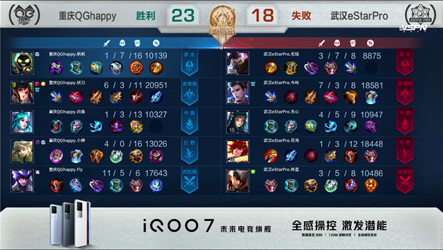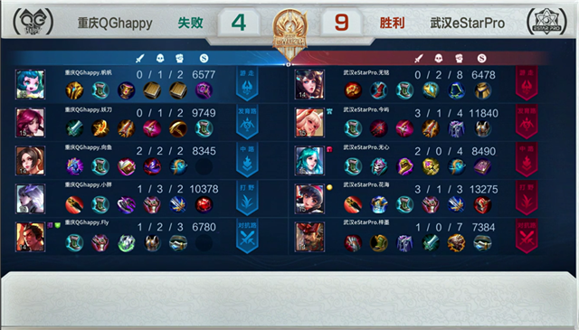 2分08秒,河道团,武汉ES击杀露娜并控下暴君。3分17秒,武汉ES入侵野区击杀廉颇。6分56秒,重庆QG拿下暴君并击杀太乙真人。10分49秒,双方团,武汉ES打出0换2。11分43秒,武汉ES击杀廉颇并控下暗影暴君。13分44秒,武汉ES拿下暗影主宰。16分12秒,武汉ES拿下暗影暴君。16分48秒,武汉ES破掉重庆QG下二塔。17分05秒,武汉ES破掉重庆QG中二塔。17分58秒,武汉ES控下暗影主宰。18分30秒,重庆QG中路高地反打打出2换5团灭对手,马可波罗拿下三杀。19分04秒,重庆QG下路一波摧毁武汉ES水晶拿到赛点。