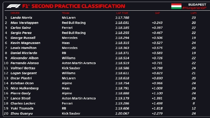 360直播讯 北京时间7月19日,F1匈牙利站二练结束,诺里斯全场最快,维斯塔潘、赛恩斯位居二、三,勒克莱尔上墙退赛,周冠宇遭佩雷兹阻挡后轮胎损坏,无有效软胎成绩,位居垫底。