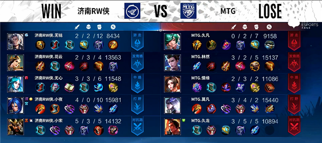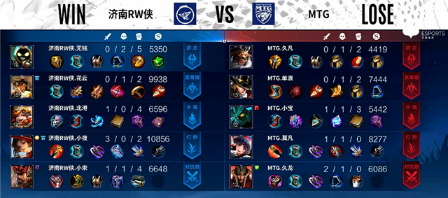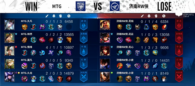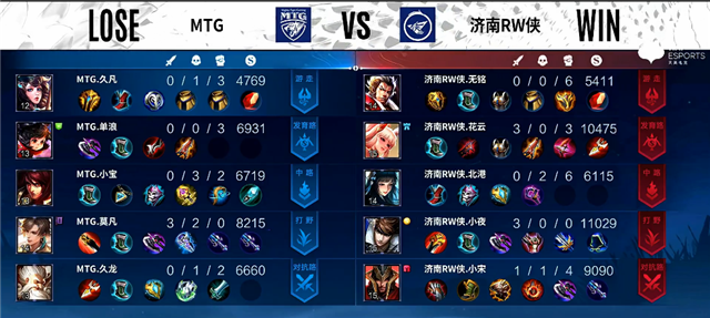 2分21秒澜拿下暴君。2分50秒河道团战,嬴政拿下一血。4分45秒济南RW侠进攻上路,虞姬被击杀。5分钟双方互换边路一塔。6分钟澜拿下主宰。7分钟澜拿下暴君,李元芳推掉下路一塔。7分24秒野区团战,东皇太一被击杀,济南RW侠中路一塔被破。10分25秒澜拿下主宰,阿古朵拿下暴君。11分钟济南RW侠推掉中路一塔。12分20秒李元芳推掉下路二塔。13分15秒上路团战,双方1换1,济南RW侠推掉上路高地塔。14分43秒野区团战,MTG打出0换2。15分20秒阿古朵拿下暴君。15分43秒澜拿下主宰。18分47秒暴君团,MTG打出0换2。19分47秒MTG推掉水晶率先拿下一分。