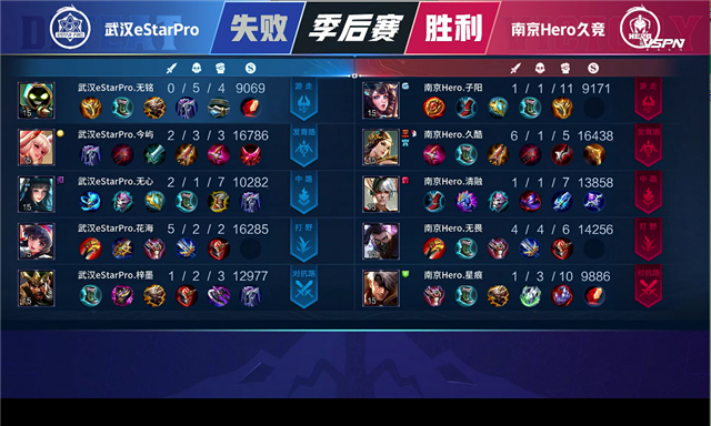 1分10秒,南京Hero裴擒虎击杀兰陵王拿下一血。4分06秒,南京Hero破掉武汉ES下一塔。4分58秒,武汉ES中路击杀王昭君,随后南京Hero破掉武汉ES上一塔并拿下先知主宰。8分47秒,南京Hero破掉武汉ES中一塔。9分06秒,河道团,南京Hero打出1换2。9分55秒,南京Hero破掉武汉ES下二塔。10分钟,双方团战1换1。10分31秒,武汉ES偷掉暗影暴君,随后南京Hero打出0换2。11分10秒,南京Hero破掉武汉ES中二塔。11分46秒,南京Hero拿下暗影主宰。12分06秒,南京Hero破掉武汉ES上二塔。12分18秒,南京Hero击杀吕布并先后破掉武汉ES中、上高地。13分钟,南京Hero团灭武汉ES,随后摧毁武汉ES水晶拿到赛点。