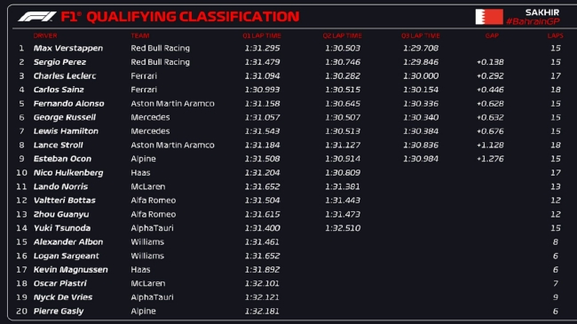 360直播讯 2023F1巴林大奖赛排位赛结束,红牛车队维斯塔潘杆位,他的队友佩雷兹第二,红牛车队包揽头排发车位。法拉利车队勒克莱尔和塞恩斯三四位。阿隆索第五,拉塞尔第六,汉密尔顿第七,斯托尔第八,奥康第九,霍肯伯格第十。周冠宇第13。