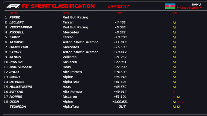360直播讯 2023年F1阿塞拜疆大奖赛冲刺赛,红牛车队的塞尔吉奥·佩雷兹取得冲刺赛胜利,收获8个积分!法拉利车队的勒克莱尔第二,维斯塔潘驾驶受损的赛车取得第三,排名第四至八位的车手分别是,拉塞尔、塞恩斯、阿隆索、汉密尔顿、斯托尔。冲刺赛前八名的车手将分别获得8-7-6-5-4-3-2-1分!