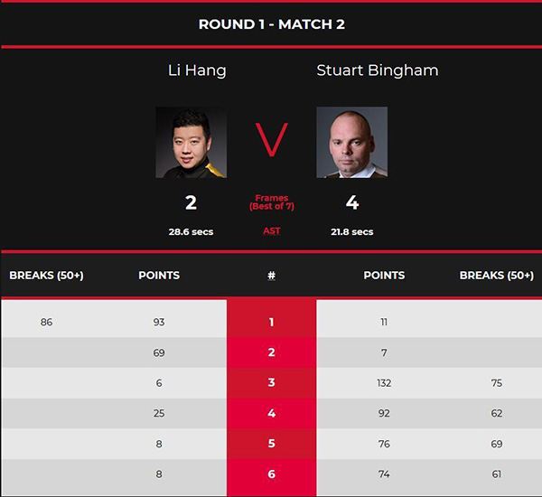 第五局比赛:开局两人陷入纠缠,李行大胆的进攻并没有太好的结果,宾汉姆则逐渐恢复了手感,单杆69分,取得赛点。第六局比赛:宾汉姆开局就上手得分,延续了自己的强势,打出单杆61分。但超分的关键时刻,宾汉姆却出现了失误,幸运地是李行再度错失机会,宾汉姆有惊无险拿下本局比赛。