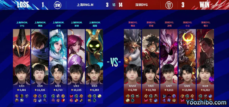 十分钟双方龙坑河道摩擦,上海RNG.M正面被打退但晚秋曜抢下暗影主宰;十二分十五秒稚念鲁班大师人群中精准拉到公孙离,深圳DYG丶钎城 鲁班七号跟上输出收下人头,深圳DYG往前铺出视野;十三分钟稚念鲁班大师蓝区拉到曜形成击杀,转上之后再拉公孙离,钎城鲁班七号二连击破;十四分钟曜蹲草被探出集火掉点,深圳DYG往正面平推;十五分半深圳DYG零换三之后压上高地,等到兵线进塔之后一波终结比赛,先拿赛点。