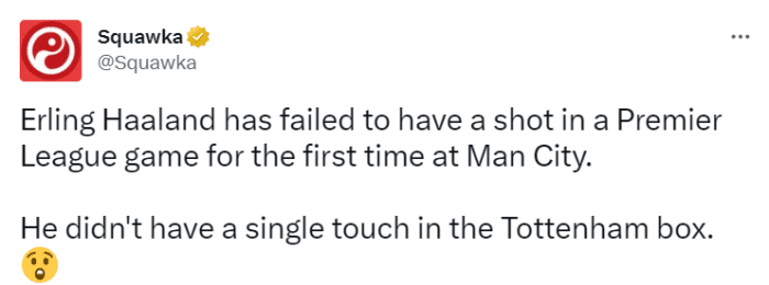 赛后据squawka统计,哈兰德全场比赛没有一脚打门,这是他加盟