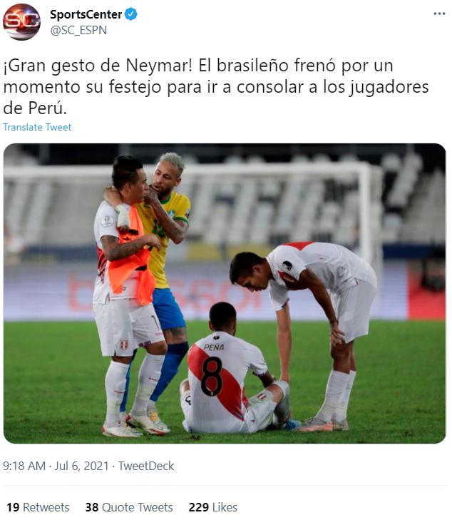 内马尔在赛后被评为全场最佳,但这位桑巴军团球星并没有得意忘形,看到秘鲁球员因为被淘汰而哭泣后,内马尔停止了自己的庆祝,并上前去安慰对手。