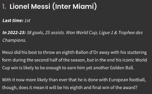 至于巴萨名宿罗伯-卡拉斯科和舆论看好梅西夺得个人第8座金球奖,是因为哈兰德没有参加世界杯,梅西参加世界杯而且夺得冠军,上个赛季在法甲也有不俗发挥。《GOAL》在欧冠决赛之后进行2022/23年金球奖热门人选排名,梅西依旧是第一名,哈兰德第二,姆巴佩和维尼修斯位居第三和第四名。