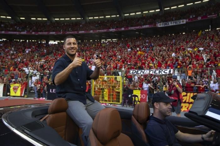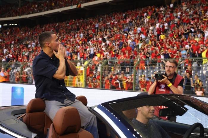 随后,阿扎尔还坐进了敞篷车并绕场一周,接受现场接近7万名比利时主场球迷的欢呼喝彩声。阿扎尔不断挥手送出飞吻,并且竖起大拇指。情到浓时,32岁的他甚至有些红了眼睛。