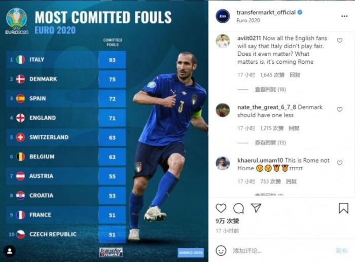 德转晒欧洲杯球队犯规排行:意大利93次占第一
