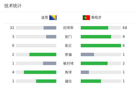 第5分钟,C罗主罚点球,他选择打向中路,这球门将判断错了方向,球稳稳打进,葡萄牙1-0波黑。