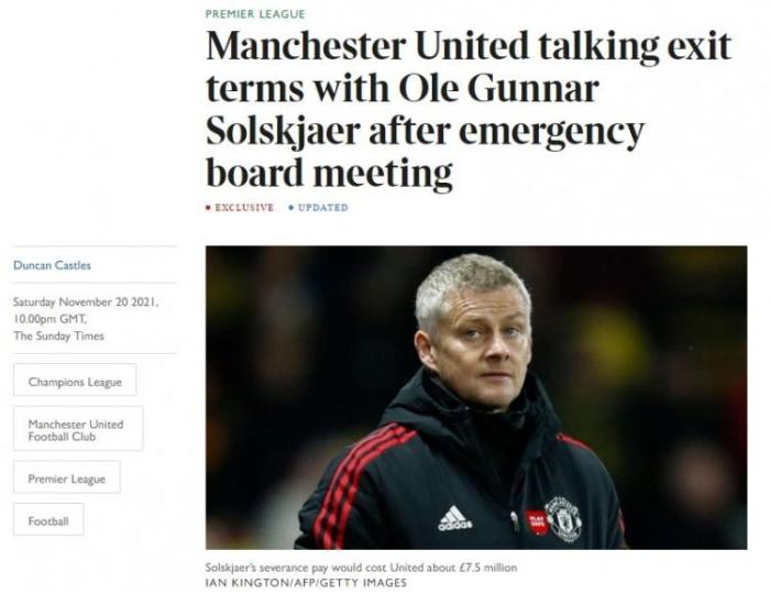 来源:360直播11-21 15:42360直播11月21日讯 据《泰晤士报》记者邓肯-卡斯尔斯报道,在今天凌晨1-4惨败沃特福德后,曼联高层召开了紧急会议,并决定解雇索尔斯克亚,索帅将拿到大约750万英镑的解约金。